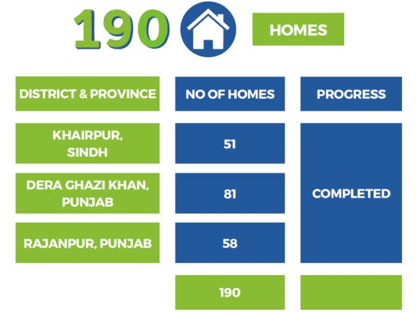 Once the immediate relief needs were addressed, we shifted our focus to long-term recovery and rehabilitation. Thanks to your generous support, we were able to initiate the second phase: Building homes for the flood-affected people. Through the use of your donation, we successfully constructed 190 homes, each equipped with a room of size 14’x16′, a washroom of size 4’x6′, solar panels (185 watts), a fan, and 2 light bulbs. These homes were designed to withstand future floods and provide a secure shelter for the vulnerable population. By providing a permanent place to live, we aimed to empower the affected communities to rebuild their lives and regain their independence.