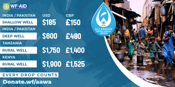 The WF-AID’s Ali Asghar Water Appeal is dedicated to bringing clean and safe water to communities worldwide through their impactful ‘Build a Well‘ Projects and ‘Water, Sanitation, and Hygiene (WASH)‘ initiatives. This commitment aims to address the pressing need for reliable access to clean water, improving the overall health and well-being of these communities. By implementing sustainable water projects and promoting proper sanitation and hygiene practices, the Ali Asghar Water Appeal endeavors to create lasting positive change and empower communities with a vital resource that is essential for life.