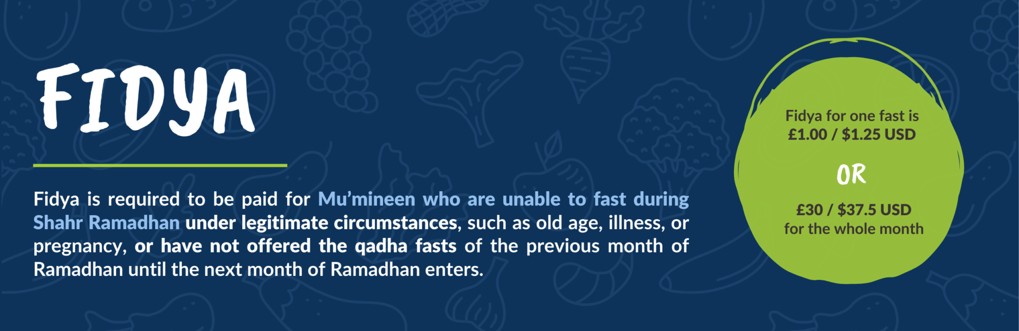 Fidya is required to be paid for Mu’mineen who are unable to fast during Shahr Ramadhan under legitimate circumstances, such as old age, illness, or pregnancy, or have not offered the qadha fasts of the previous month of Ramadhan until the next month of Ramadhan enters. The calculation is determined by the cost of staple food (cooked or raw) weighing approximately 750 grams (also known as a mudd), based on the location of the recipient.