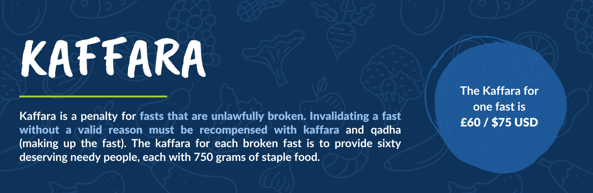 Kaffara is a penalty for fasts that are unlawfully broken. Invalidating a fast without a valid reason must be recompensed with kaffara and qadha (making up the fast). The kaffara for each broken fast is to provide sixty deserving needy people, each with 750 grams of staple food.