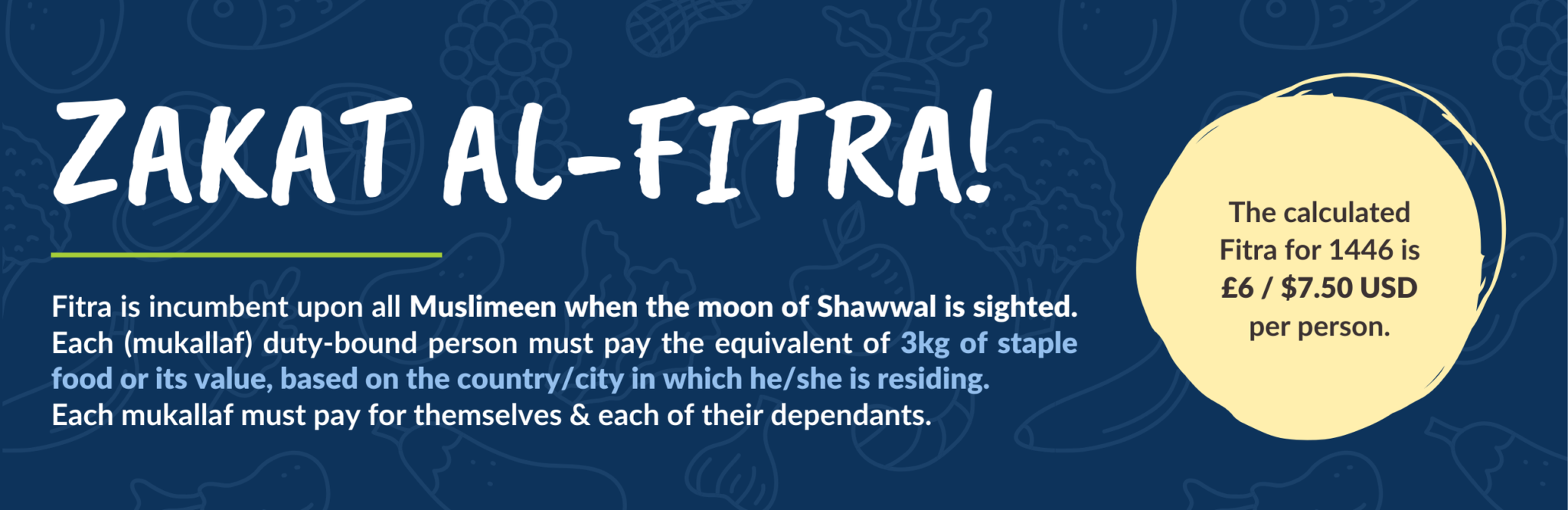 Fitra is incumbent upon all Muslimeen when the moon of Shawwal is sighted. Each (mukallaf) duty-bound person must pay the equivalent of 3kg of staple food or its value, based on the country/city in which he/she is residing. The economic situation worldwide, particularly inflation levels, has surged significantly. Through a thorough market analysis conducted by WF-AID, focusing on rice as the most widely consumed staple food across the UK.