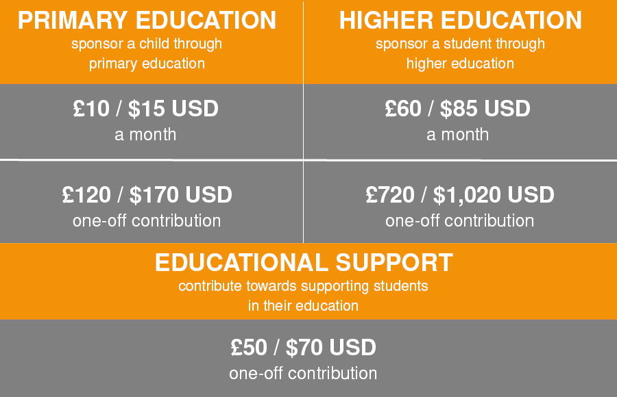You can fully sponsor a student through a university degree or a higher diploma for £60 a month or £720 a year.